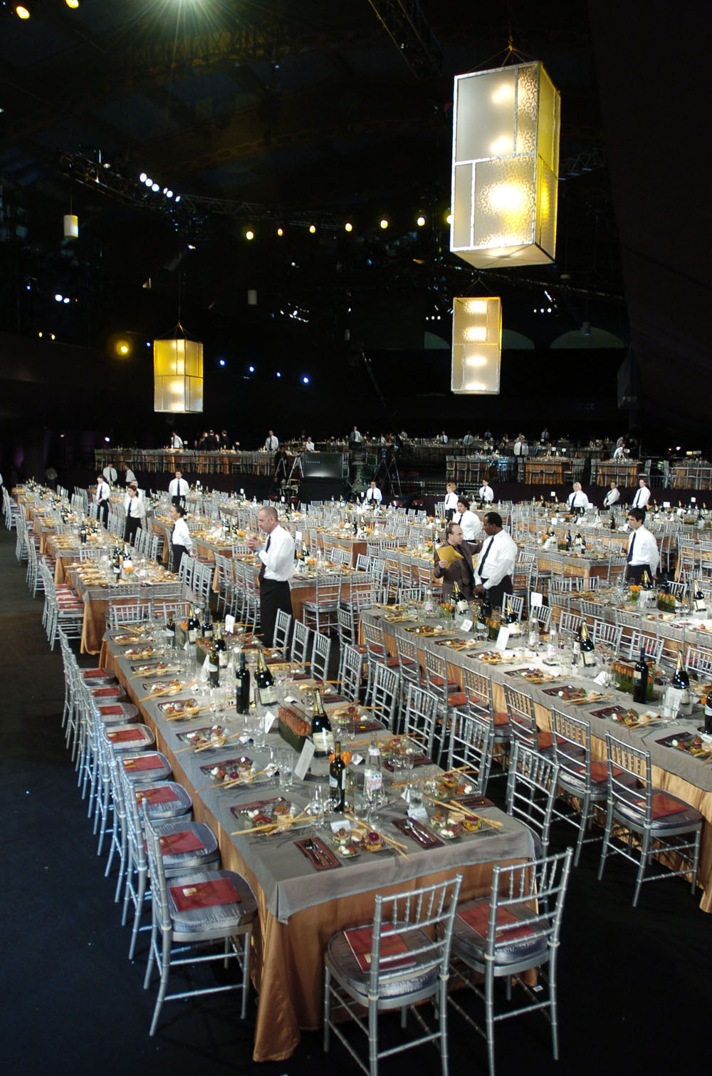 The 11th Annual Screen Actors Guild Awards® stunning production design paid visual tribute to the film and television industry. Flowing sheets of water were a reminder that the Actors® honor performances conveyed through a moving image. Design elements in glass, copper and silver were used in the set architecture, showroom and table decor in homage to the materials from which lenses, lights, cables and film are made.