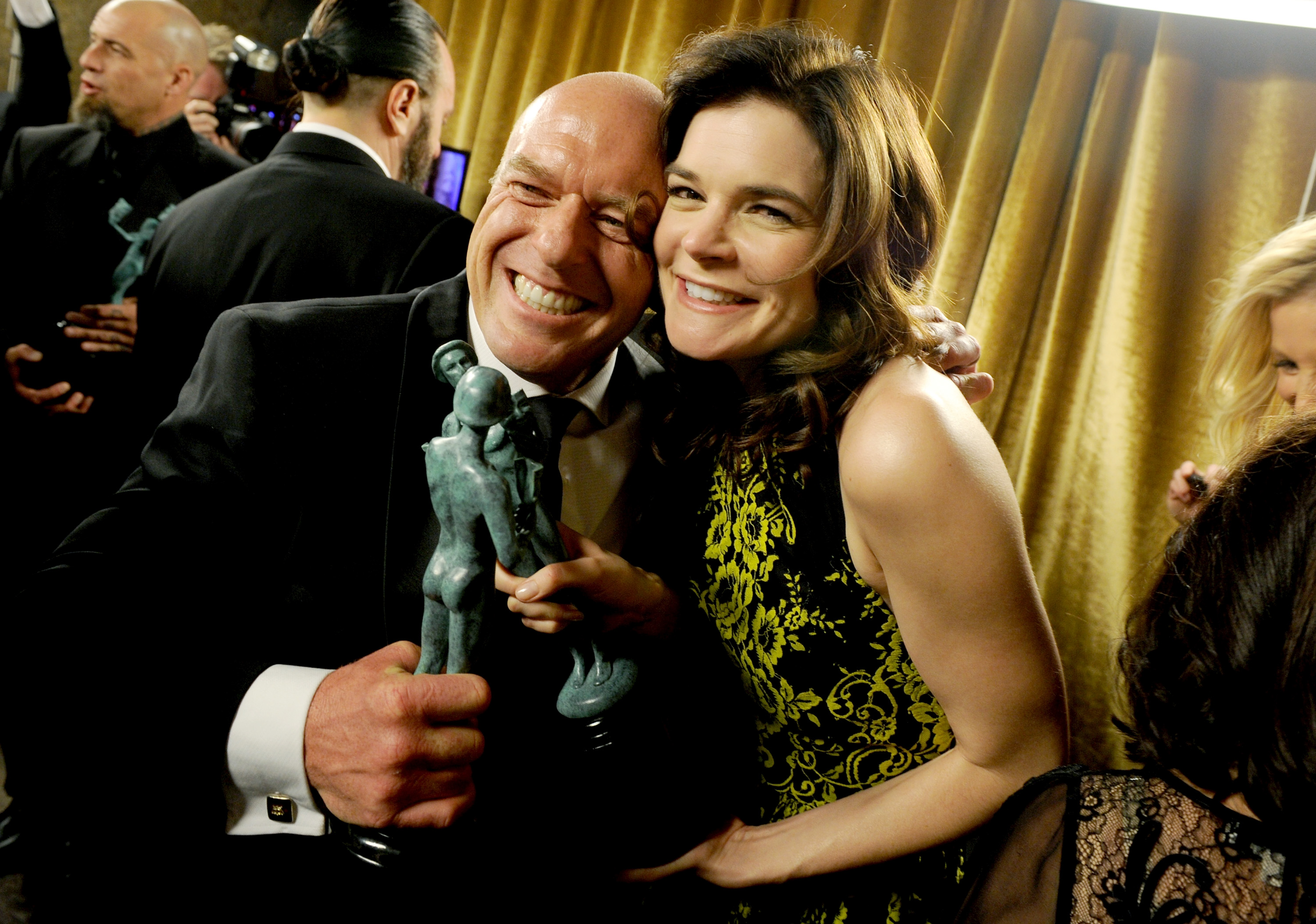 The 20th Annual Screen Actors Guild Awards began with a bang as the red carpet was opened with its signature Taittinger champagne toast, led by American Hustle’s Elisabeth Röhm and Clovis Taittinger, the Export Manager for Champagne Taittinger. Next, both nominees and presenters took to the red carpet, walking its 15,872 square feet to pose for photographs and talk to the international media. Exciting those in the bleacher seats, actors like Bradley Cooper (American Hustle) and Oprah Winfrey (12 Years a Slave) stopped to say hello to fans and to sign autographs.