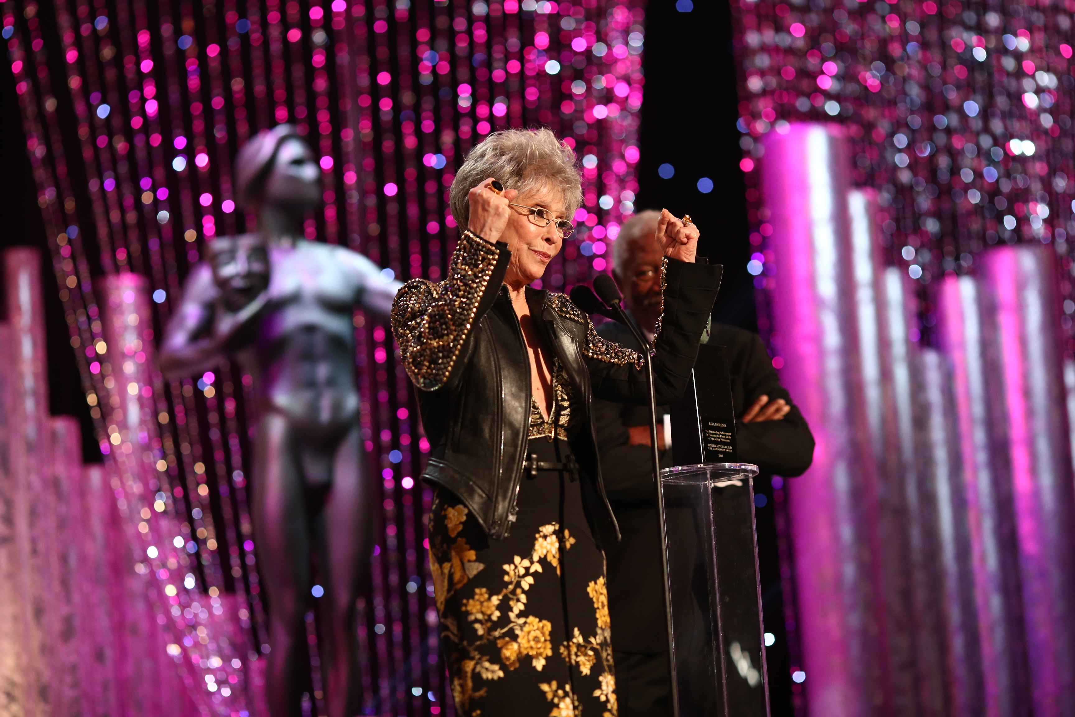 Not only was this year the 20th year of the Screen Actors Guild Awards, but it was also the 50th presentation of the Life Achievement Award. This year’s recipient Rita Moreno, truly fosters the “finest ideals of the acting profession.” Longtime friend and colleague Morgan Freeman presented the honor to Moreno, who both spoke and sang her emotional response to receiving the recognition. Honoring the actors who passed away in 2013, Tom Hanks (from Captain Phillips) took the stage to introduce the “In Memoriam” montage. Actor® recipient Ben Affleck (for Argo in 2013) announced the last award for outstanding performance of a cast in a theatrical motion picture.