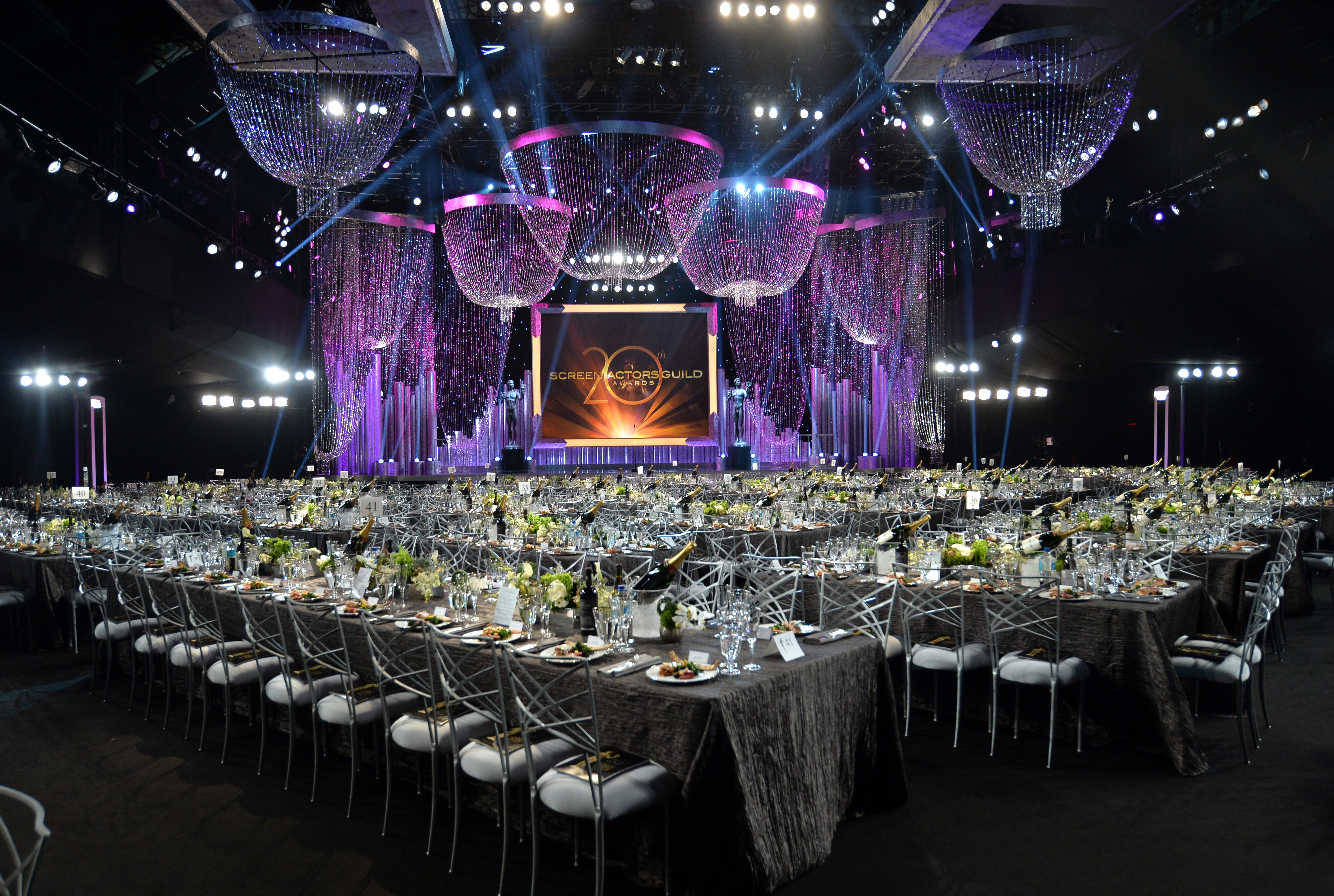After the awards concluded, guests made their way over to the official Post-Awards Gala on the Shrine’s back lot. The Gala, hosted by PEOPLE Magazine and EIF, and produced and designed by Tony Schubert of Event Eleven, honored the SAG Foundation and actor’s philanthropic events. The inside of the tent where the Gala took place was richly adorned with 5,000 yards of pewter colored tapai silk with custom designed lattice panels made of acrylic and live moss. In the center of the room there were four large bronze moss-covered arches that reached 22 feet tall. While some guests lounged on plush sofas and ottomans, many took to the dance floor dancing the night away to sounds spun by DJ Michelle Pesce.